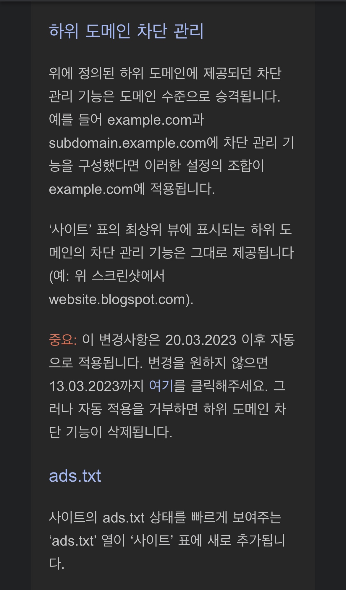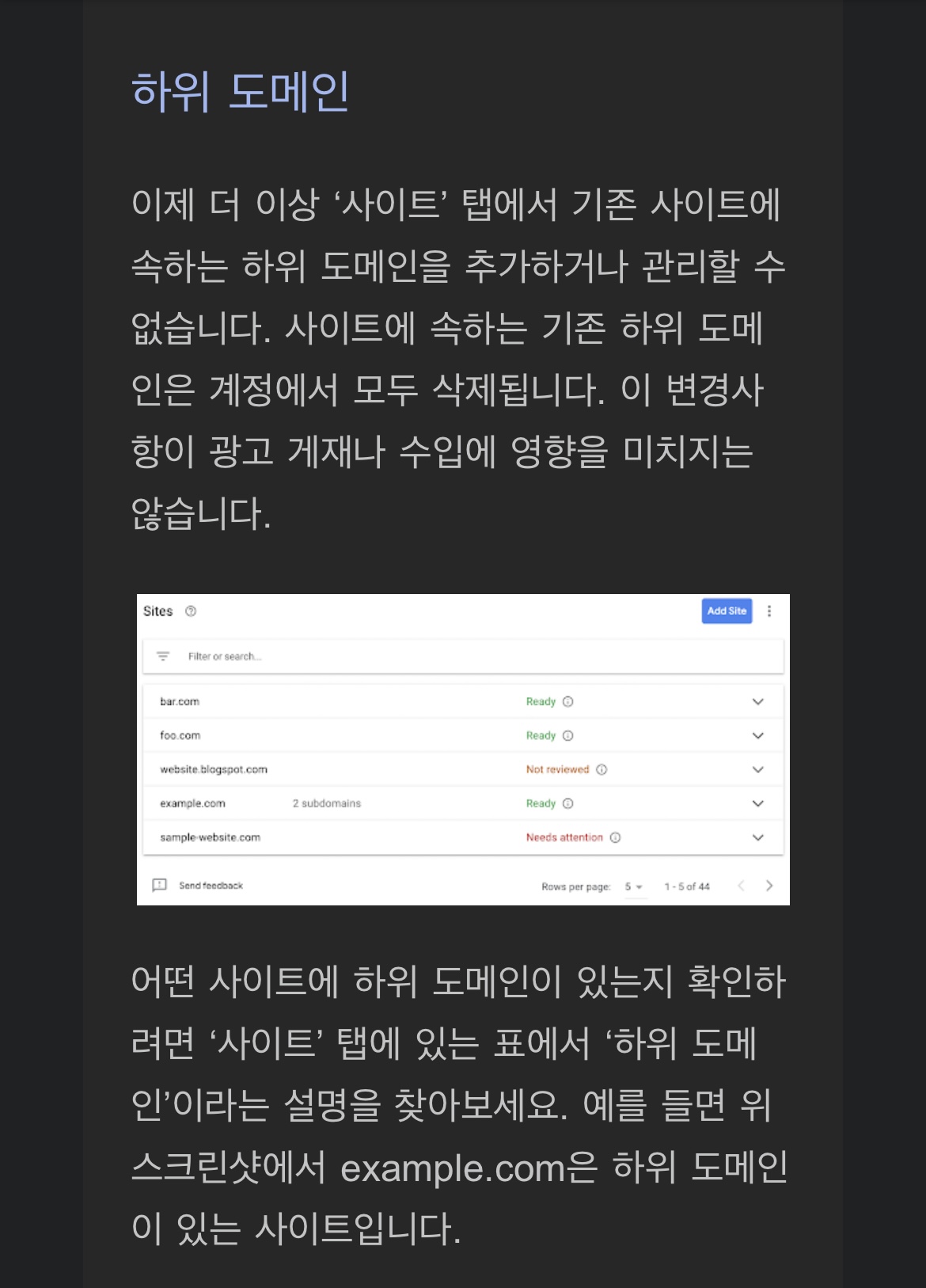 특히나 사이트에 속한 계정의 기존 하위 도메인은 모두 삭제 예정입니다. 이 변경사항이 광고 게재나 수입에 영향을 미치지는 않습니다.
