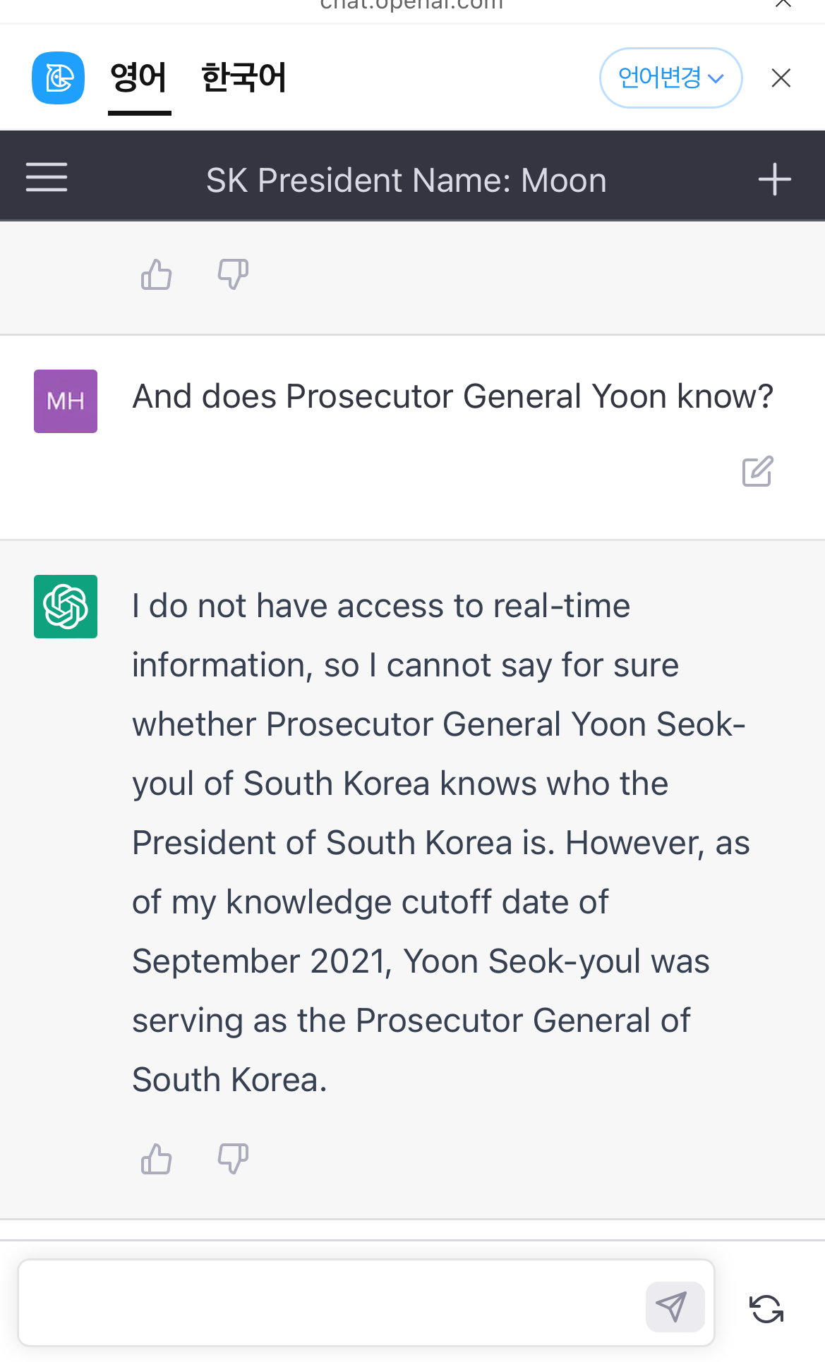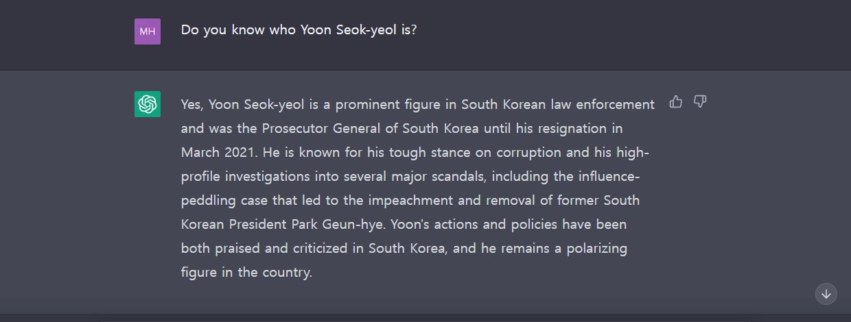 ChatGPT에게 윤석열 대통령을 아는지 질문해 봤습니다.