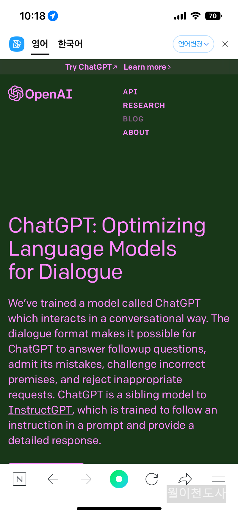 자~ 이제부터 무엇이든 물어보세요~ 질문이 반복될 수록 완성도 있는 답변을 만들어냅니다. ChatGPT의 기본은 언어 모델입니다. 앞서 제시한 단어들을 통해 다음 단어를 예측하는 모델이라고 할 수 있습니다. 해서 방대한 양의 데이터를 강화 학습 알고리즘을 통해 더 정교한 대답을 해 낼 수 있습니다.